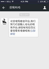 關(guān)注后會(huì)自動(dòng)彈出立即綁定的消息,點(diǎn)擊綁定賬號(hào)。