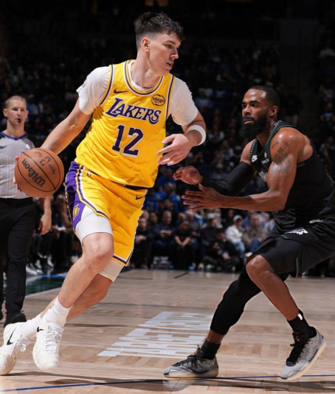 在24-25 賽季在灰熊的 47 場比賽里,拉拉維亞場均僅獲 20.9 分鐘,即便交出 7.3 分 4.4 籃板 2.8 助攻、三分 44.4% 的高效數(shù)據(jù),仍因 “終結(jié)不穩(wěn)定” 被貼上 “功能性替補” 標(biāo)簽。二月份輾轉(zhuǎn)國王后,他的出場時間縮水至 19.3 分鐘,數(shù)據(jù)滑落至 6.3 分2.8籃板1.3助攻,成為戰(zhàn)術(shù)板上可有可無的角色。彼時聯(lián)盟無人預(yù)料,這個在國王得不到重任的白人前鋒,會在湖人迎來涅槃。