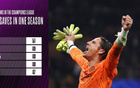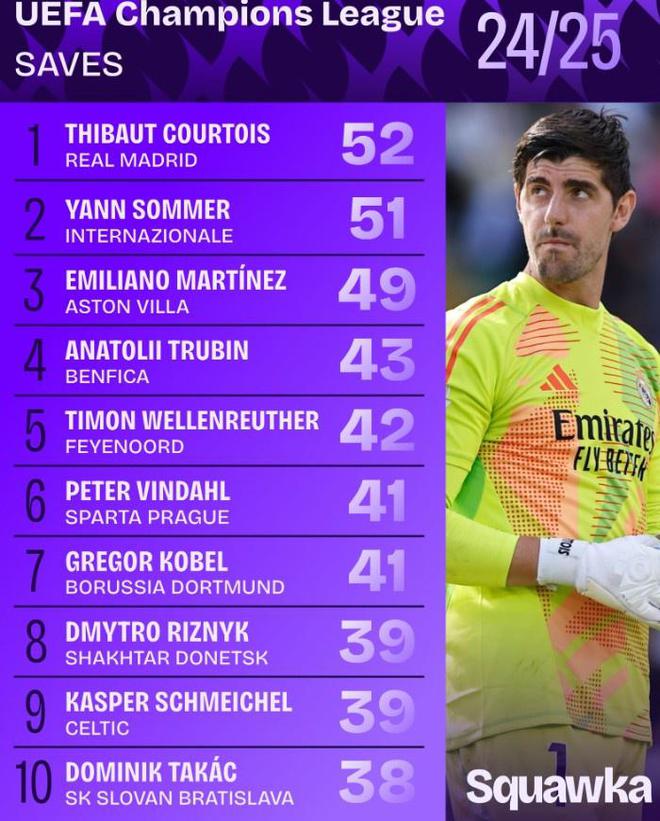 2024-25賽季歐冠撲救榜:庫爾圖瓦52次居首,索默51次位居次席