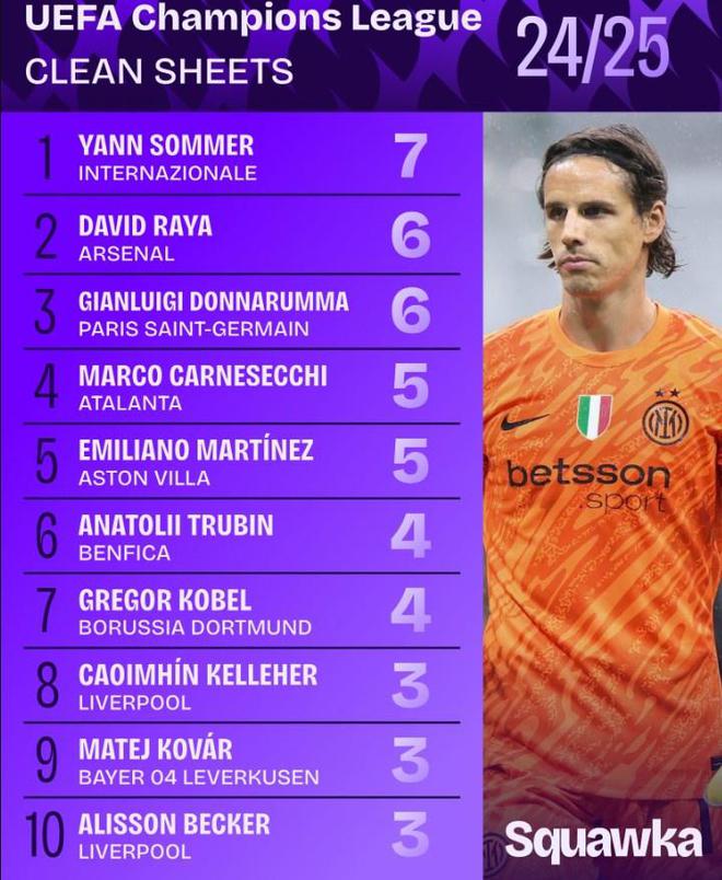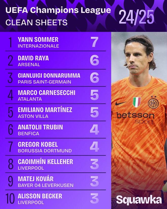 2024-25賽季歐冠零封榜:索默7次居首,拉亞、多納魯馬6次次之