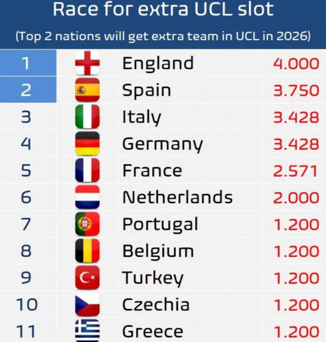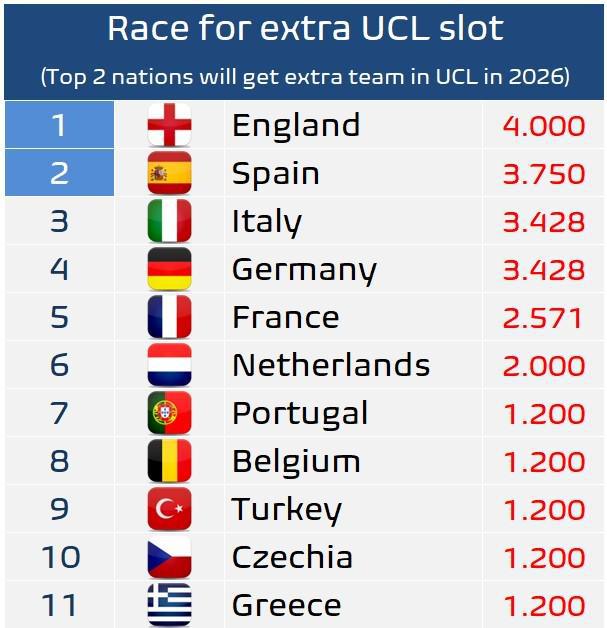 下賽季歐洲聯(lián)賽歐戰(zhàn)積分出爐:英格蘭、西班牙獲得額外歐冠席位